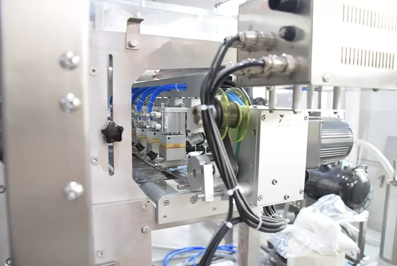 2. Función principal de la máquina: película dividida automática en la posición correcta, medición y llenado de líquidos, sellado de llenado de forma de bolsa de múltiples carriles, corte, seguimiento del sensor, capacidad de conteo.