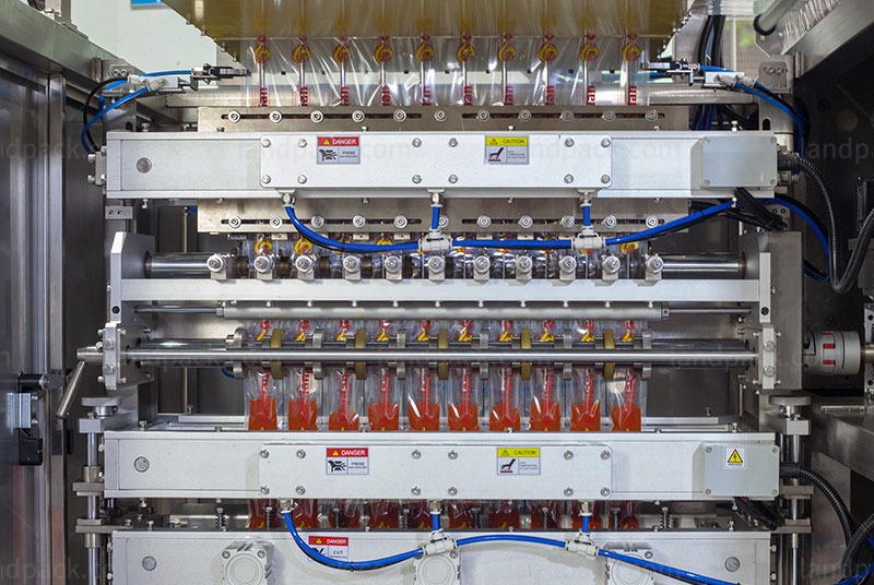 2. Función principal de la máquina: película dividida automática en la posición correcta, medición y llenado de líquidos, sellado de llenado de forma de bolsa de múltiples carriles, corte, seguimiento del sensor, capacidad de conteo.