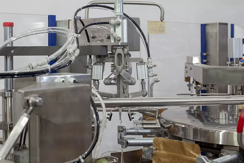 | Flujo de trabajo | dando bolsa→codificación →apertura →llenado 1 →llenado 2→auxiliar→escape→sellado térmico→formado y producto de salida |